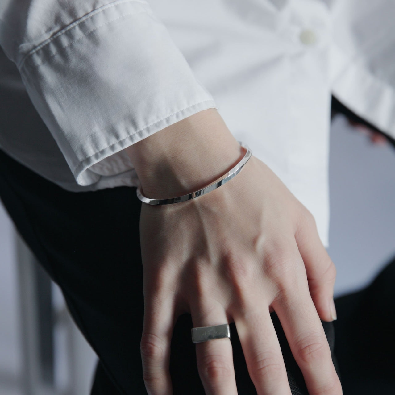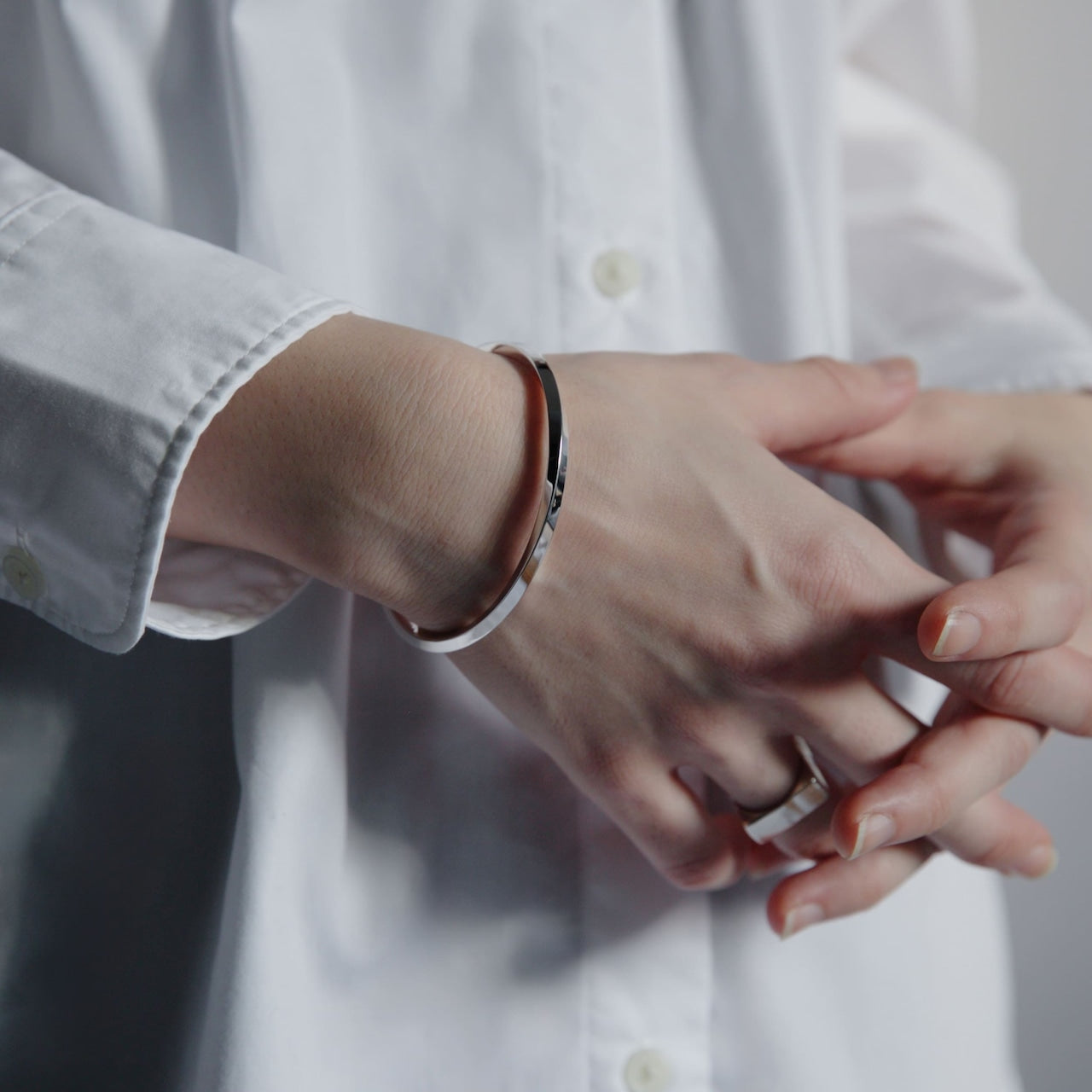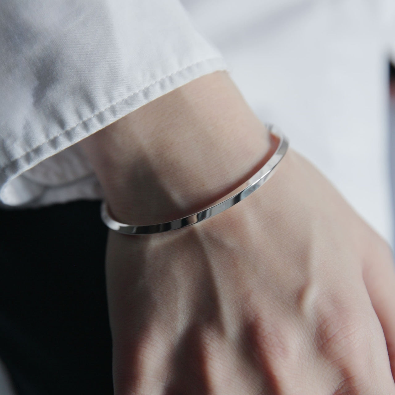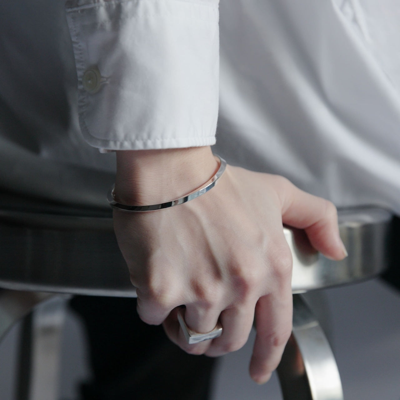 幅3mmの角棒をねじることで、手首が華奢な方でもお使いいただきやすい、程よいボリュームへ仕上げました。