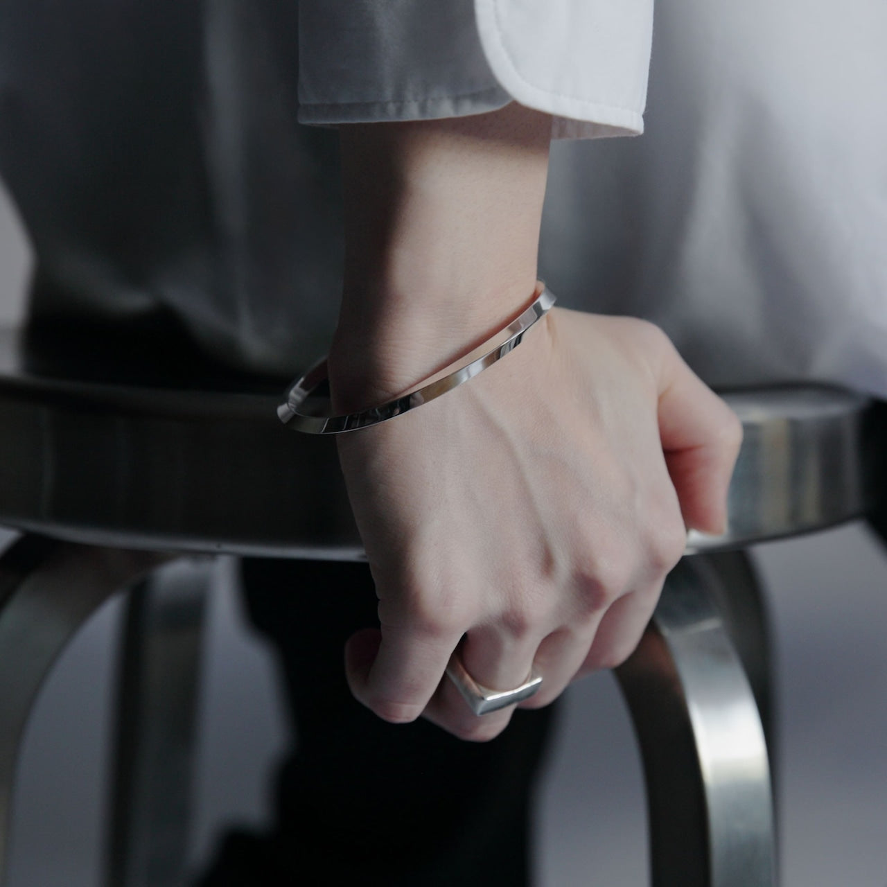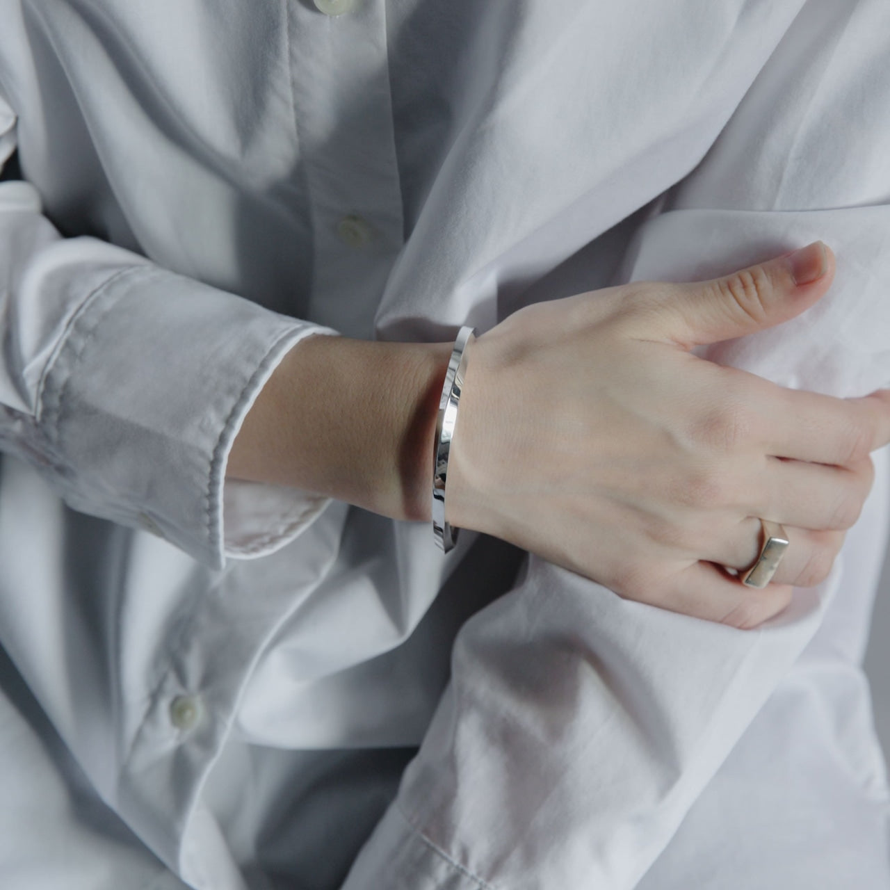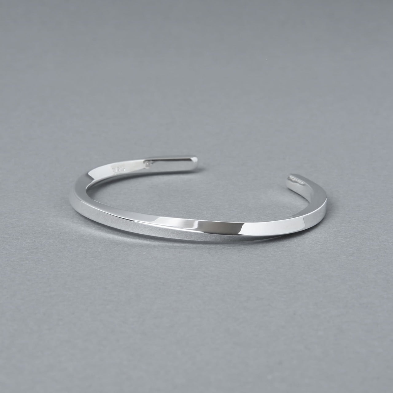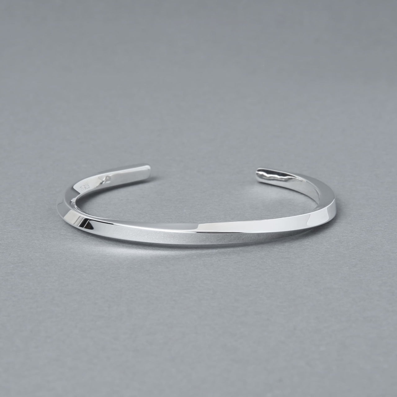 幅4mmの角棒をねじることでボリュームが出るので、圧倒的な存在感を放つバングルです。