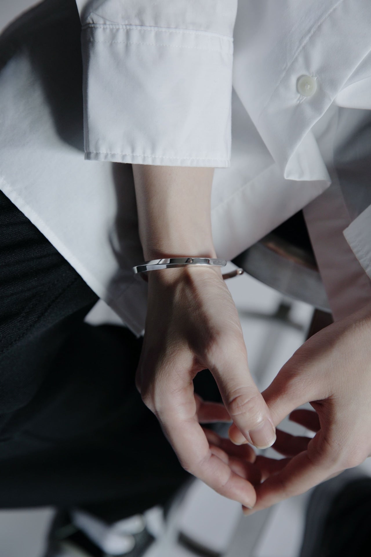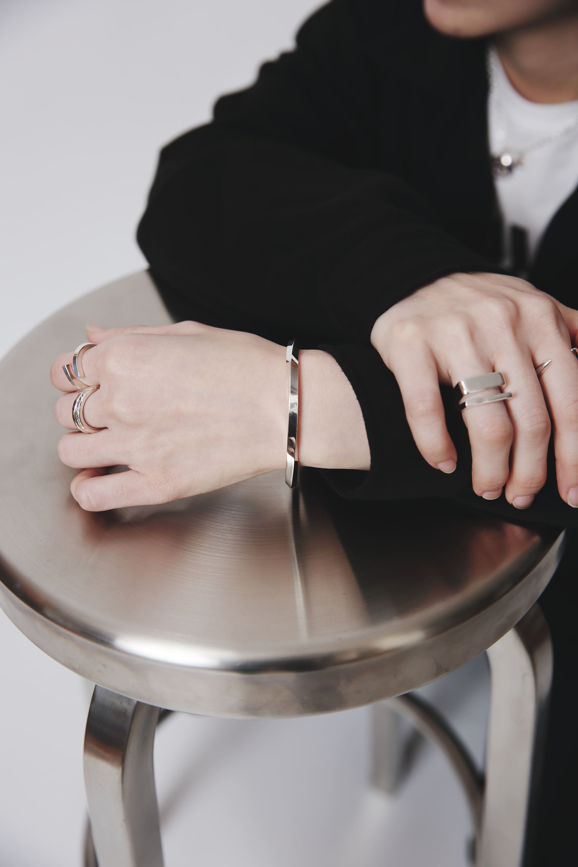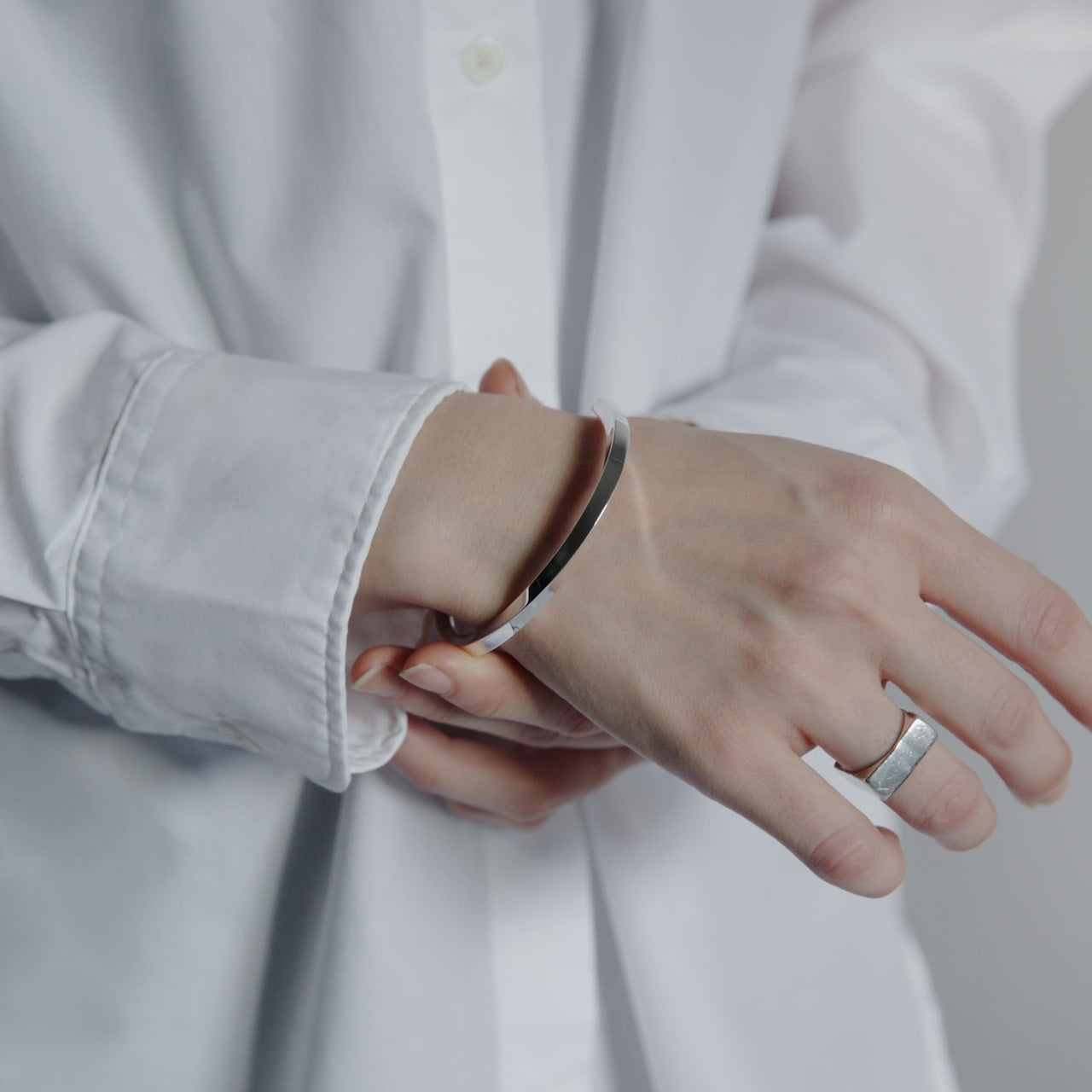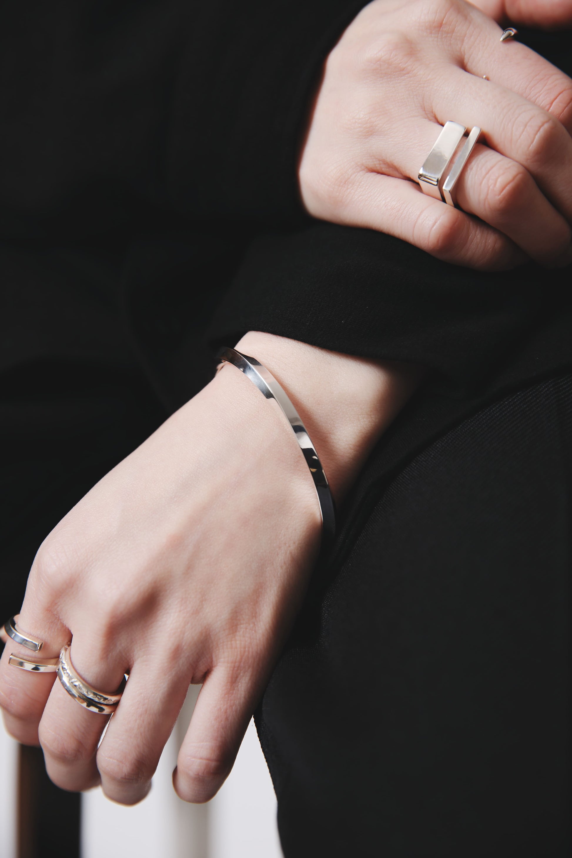 幅4mmの角棒をねじることでボリュームが出るので、圧倒的な存在感を放つバングルです。